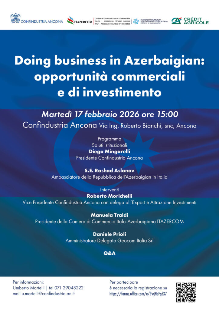Martedì 17 febbraio, alle ore 15:00, ospiteremo in Confindustria Ancona S.E. Rashad Aslanov, Ambasciatore della Repubblica dell’Azerbaigian in Italia, per un incontro di approfondimento sulle opportunità commerciali e di investimento offerte dal Paese euroasiatico.