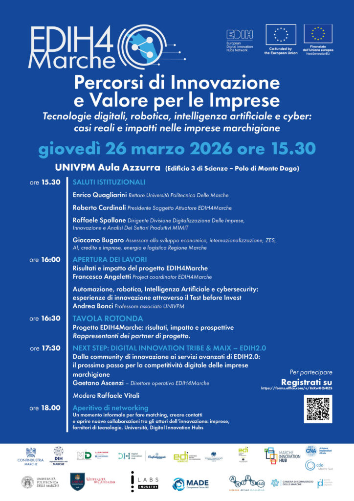 Nel corso dell’evento saranno presentati i risultati e l’impatto del progetto EDIH4Marche che si concluderà il 30 aprile 2026, insieme a esperienze concrete di innovazione sviluppate attraverso il programma Test Before Invest. L’evento proseguirà con una tavola rotonda dedicata al futuro dell’ecosistema dell’innovazione regionale con la presenza di tutti i partner di progetto e con un momento di networking tra Imprese, Fornitori di Tecnologia, Università e Digital Innovation Hub.